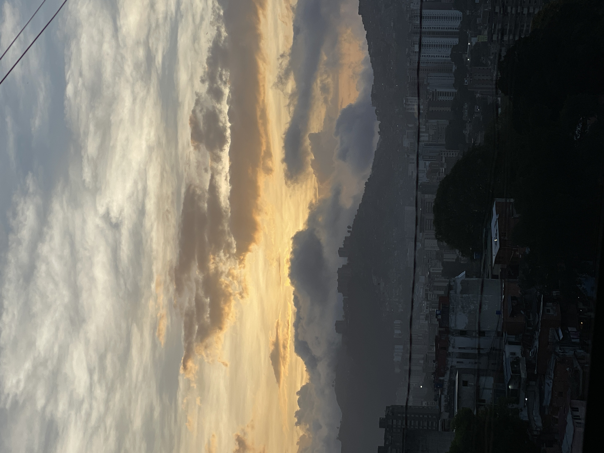 view of Caracas, Venezuela at dusk. The left side of the image is dominated by a cloudy sky, tinged with yellow light from the setting sun. The center of the image features a mountain range with a city built on its slopes. The right side of the image shows buildings. Power lines are visible in the upper-left corner. The foreground is in shadow, obscuring details of the neighborhood, although the forms of houses and buildings are discernible.
