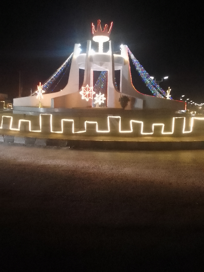 A brightly lit roundabout dominates the frame at night. The central structure is white, seemingly made of interconnected arches, and topped with a red crown. Colorful lights drape from the arches, creating a festive feel. A few star-shaped lights adorn the base of the structure. The roundabout's perimeter is outlined with a pattern of square-shaped, yellow lights that mimic a fortress wall. The foreground is a dark, paved road reflecting some light from the roundabout. Street lights are visible in the background, adding to the overall illumination.