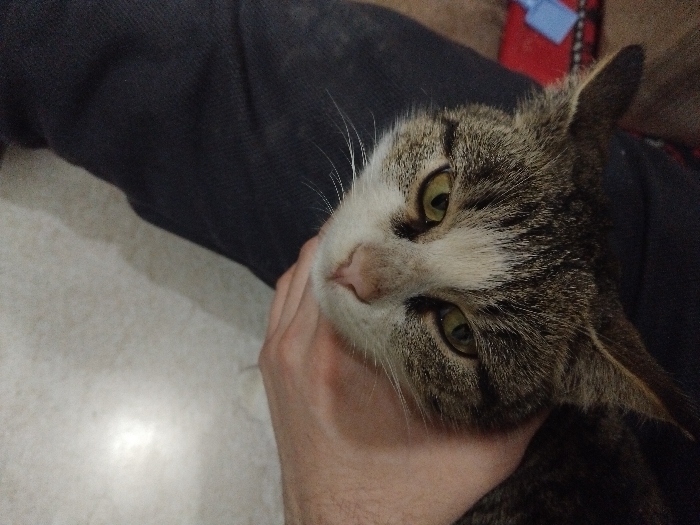 The image captures an indoor scene in the city of Unknown, Unknown. A domestic tabby cat with brown, grey, and white fur is prominently featured, its head inverted relative to the camera's vertical axis. The cat possesses greenish-yellow eyes that are directly focused on the camera, a pink nose, and pronounced white whiskers. A human's bare right hand, with visible forearm hair, is positioned on the cat's neck and jawline, indicating physical interaction. Dark, textured fabric, likely clothing or a blanket, is visible beneath and to the right of the cat's head. The background consists of a light-colored, textured surface in the upper left quadrant and a blurry red object with a blue detail in the lower right, suggesting furniture.