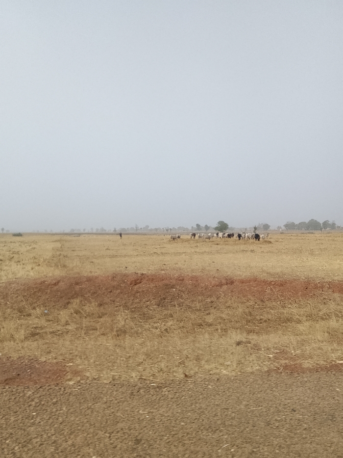 The image depicts an expansive, dry, open field under an overcast, hazy sky in Shendam, Nigeria