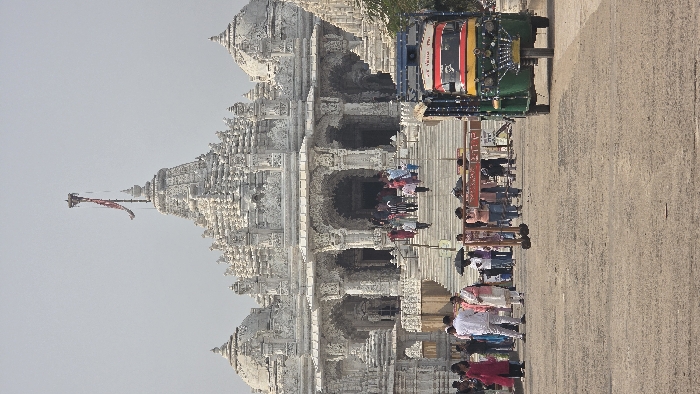 A large, ornate white temple rises on the left, its spires and intricate carvings prominent. People gather near the entrance, ascending the steps. A colorful auto-rickshaw is parked on the right side of the temple. A signpost in front of the steps indicates directions in a language other than English. The temple and auto-rickshaw are situated beside a long paved path. The photograph is rotated counterclockwise, with the path running vertically.