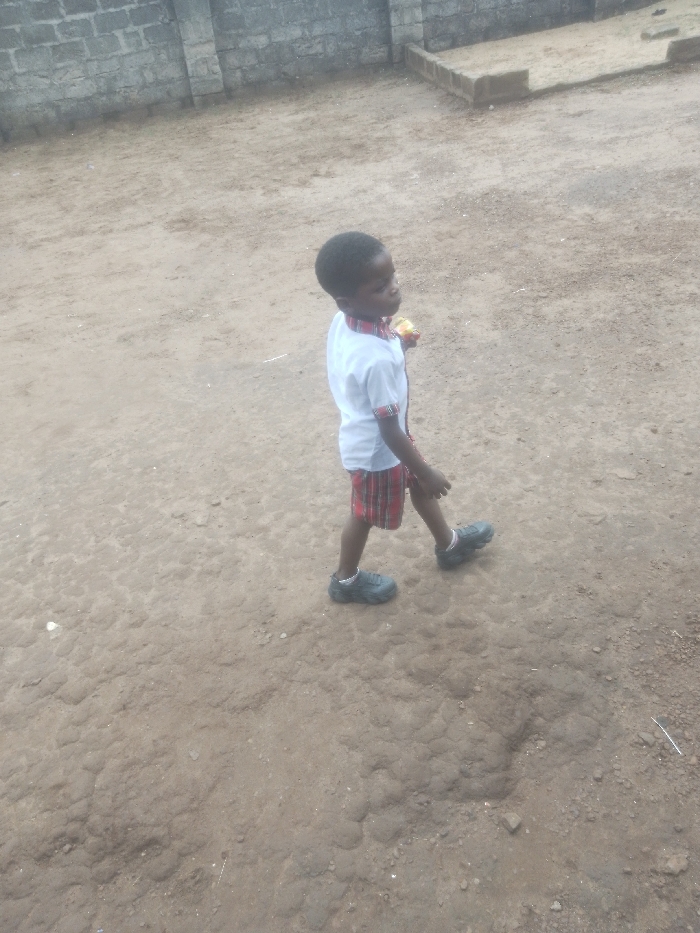 A young male child is depicted walking from left to right across an uneven, light brown dirt or sand ground in Ukwu-Abwa, Nigeria