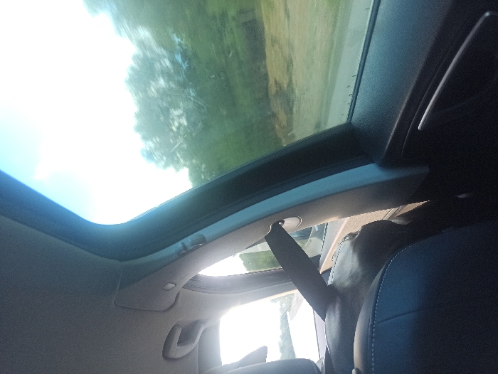 The image captures the interior of a vehicle in motion within the city of Gueznaïa, Morocco, viewed from a rearward perspective. The upper left of the frame shows a light-colored car headliner. A dark grey or black car seat is prominent in the lower left, with a dark-clothed arm or shoulder resting on it. A black seatbelt is securely fastened, extending from its anchor point on the B-pillar towards the lower portion of the frame. The B-pillar and a dark grey door panel with a recessed handle are visible on the right side. Outside the vehicle, a bright, clear sky occupies the upper external portion of the view, with blurred green trees and foliage below, indicative of travel past a vegetated area. A light-colored road surface is faintly discernible in the distant background through the windows.