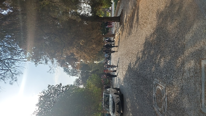 This image depicts an outdoor scene within the Ash-Shaghour Municipality, Syria, on what appears to be a sunny day. A wide, unpaved or gravel-covered road, or path, recedes into the distance, lined on both sides by numerous trees exhibiting varying degrees of foliage; some are lush green, while others display autumn colors or appear sparser. Strong sunlight emanates from the upper left quadrant, casting distinct shadows across the road surface. In the foreground, two dark-colored utility covers are embedded in the road. On the left side of the road, a white SUV is parked, facing away from the camera, with its front visible and a license plate attached. A group of approximately 10-15 individuals, predominantly adults, are visible walking along the road, generally moving away from the viewer. Many of the female individuals are wearing head coverings. On the right side of the path, a raised curb or planter area is visible, containing trees and some red, vertical structures, possibly bollards or decorative elements. More people are discernible further down the path and in the background, amidst the trees and light. The sky is bright with visible glare from the sun.