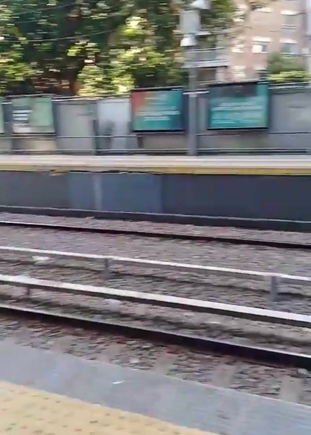 train station platform. The camera pans across the platform and the train tracks. A person with a bicycle is standing on the platform. There are other people on the platform, but they are not the focus of the video. The platform is marked with yellow tactile paving. The sky is visible above the trees in the background.