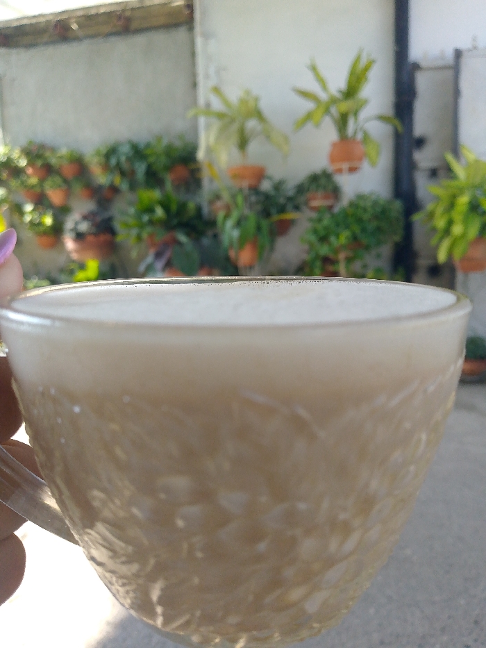 - "A human hand, displaying a thumb with purple nail polish, holds a clear glass mug containing a frothy, light brown beverage" by FM-1fjaU2, licensed under CC BY 4.0