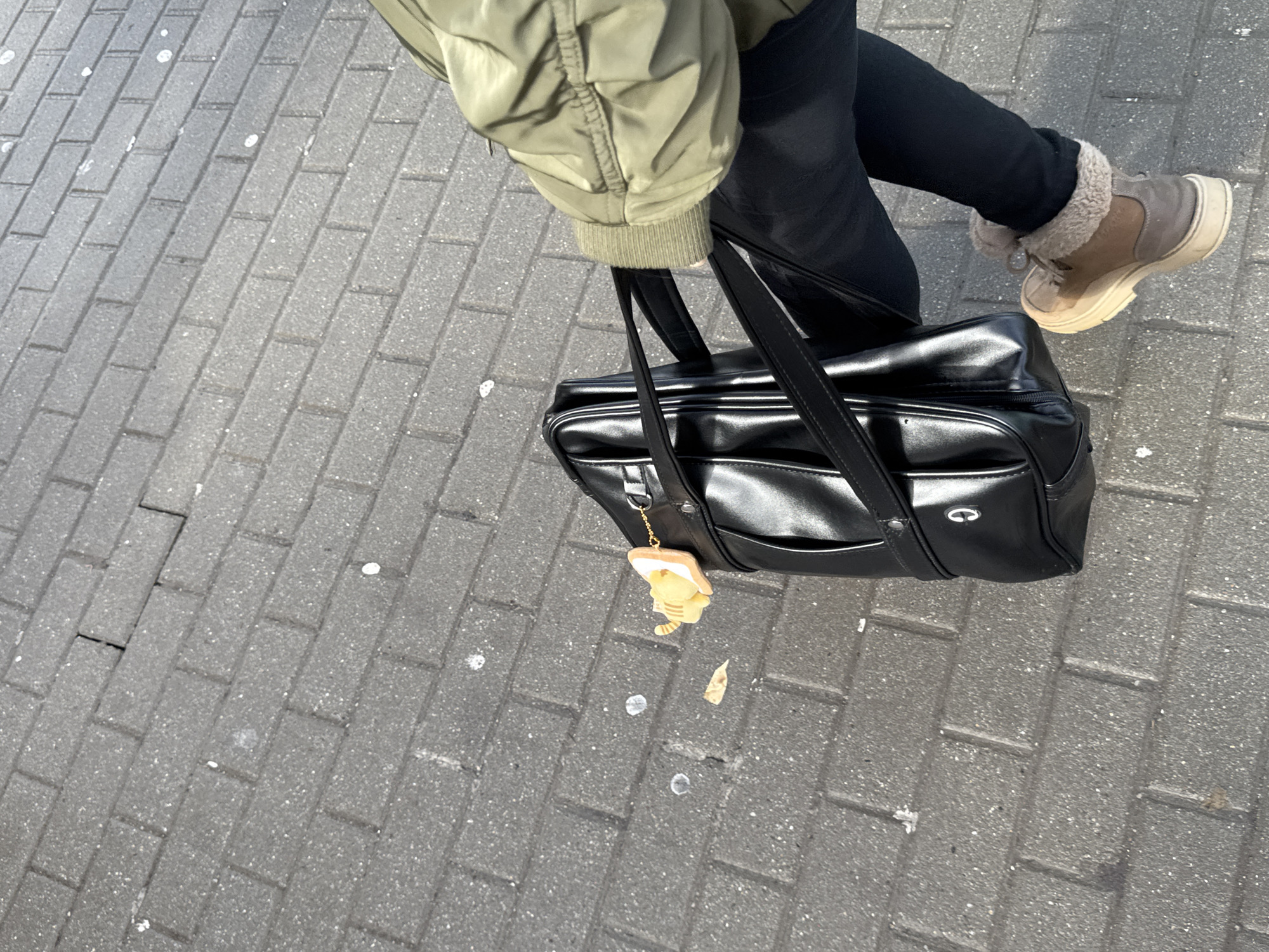 A person stands on a brick-paved surface, likely a sidewalk. The person is wearing black pants, a light green jacket, and tan-colored boots with fur trim. They are holding a black, rectangular bag with a charm attached. The background consists primarily of the brick-paved surface. There is no definitive information to confirm the location in Sofia, Bulgaria.
