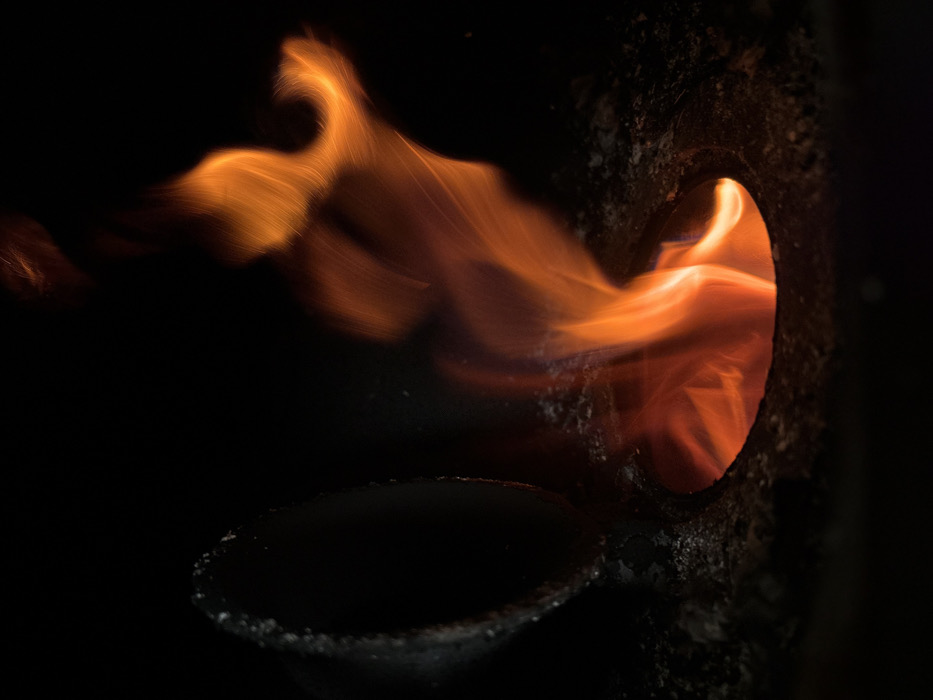 In Munin, Syria, a vibrant orange and red flame column emanates upwards from a circular aperture set into a dark, coarse, and residue-covered surface. This surface shows evidence of heat exposure. To the left of the flame, a portion of a larger, dark, curved structure or container with a similar rough texture is partially visible. The background is uniformly dark. No individuals are present in the frame.