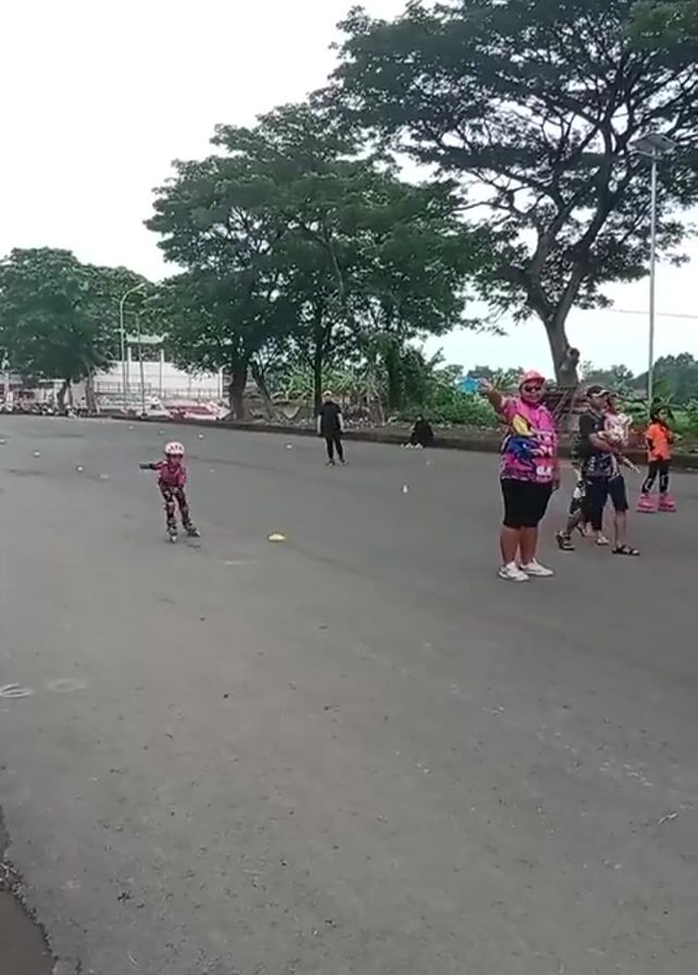 A video shows several people, including a child, in a large open asphalt area. Some are roller skating. The child, wearing pink and black protective gear and roller skates, skates toward the camera. Several adults stand or walk in a group to the right side of the screen. A few other individuals stand or walk in the background. Yellow cones are scattered on the ground. Green trees provide a backdrop. The sky is overcast.