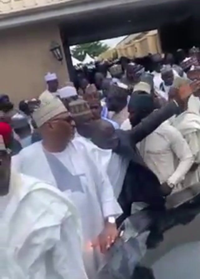 A crowd of men mostly wearing white robes and various hats are moving in a packed group. The scene appears to be outside a building with a gated entrance. One person in the foreground is wearing a dark suit and a green lanyard. The camera moves along with the crowd. The sound of a car horn can be heard.