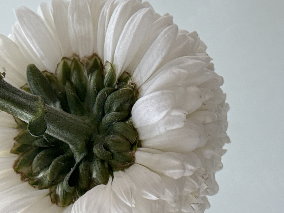 The image presents a detailed, inverted view of the underside of a white flower. Numerous layered white petals form the periphery of the bloom, converging towards a central structure of dark green sepals. These sepals encase the base of a fuzzy, green stem, which extends upwards and out of the frame. Slight browning is visible on some edges of the sepals where they meet the petals. The background is uniformly light grey-blue, providing no additional environmental context. No individuals or specific actions are depicted. The scene is situated in the city of Dubai, United Arab Emirates.