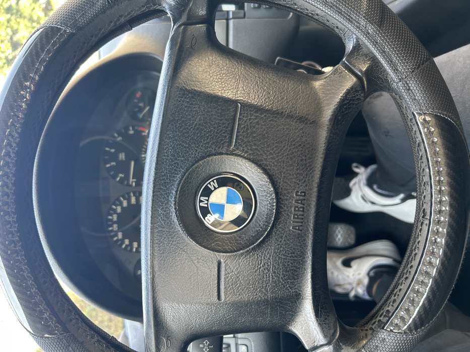 This image forensically captures the interior of a BMW vehicle, located in Gerakas Municipal Unit, Greece. The central subject is a black, textured BMW steering wheel featuring the brand's logo and "AIRBAG" text, partially covered by an aftermarket black carbon fiber and textured grip cover. Directly behind the steering wheel, a segment of the vehicle's instrument cluster is visible, displaying a speedometer marked up to 220 km/h and a tachometer. Below the steering wheel, the lower legs of an individual, dressed in dark trousers, are visible. Both feet, clad in white and black athletic sneakers, are positioned over two silver vehicle pedals, one of which is clearly identifiable as a clutch pedal, indicating a manual transmission. The scene is illuminated by natural daylight, suggesting an outdoor or brightly lit environment beyond the vehicle's windshield, which is out of focus. No other individuals or explicit actions beyond the positioning of feet on pedals are depicted.