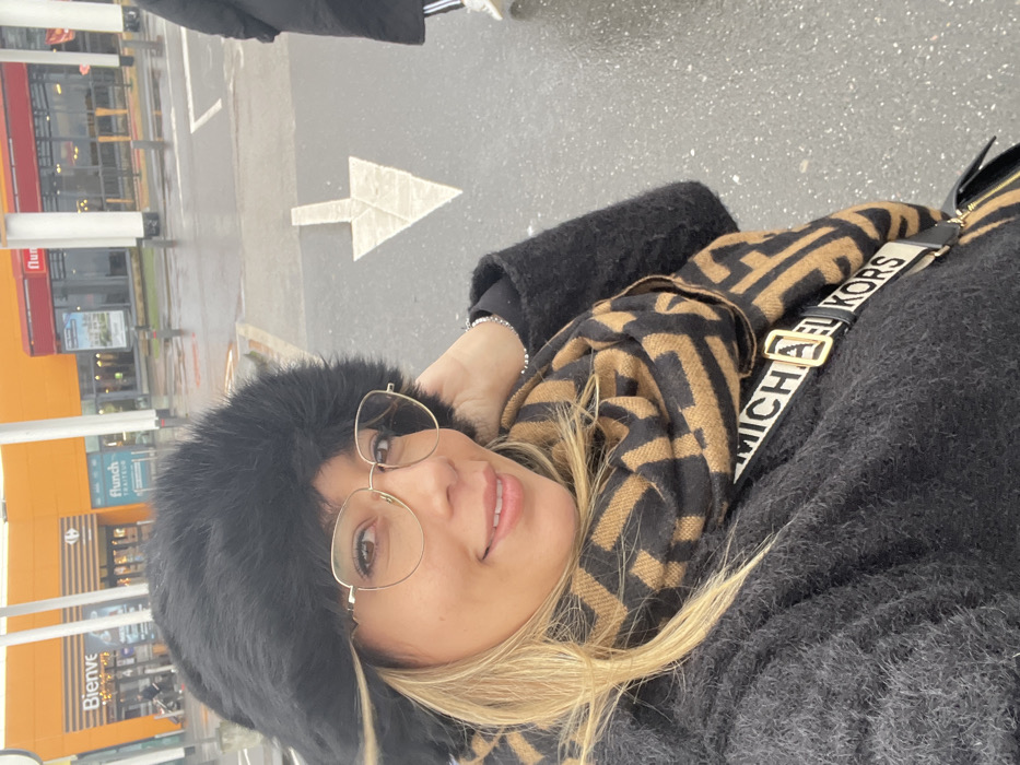 The image features a woman in the foreground, centered within a commercial area identified as the Carrefour shopping center in Hérouville-Saint-Clair, France. The woman, with light blonde hair, wears a black faux-fur hat, round gold-rimmed eyeglasses, and a dark, textured coat. She has a brown and black patterned scarf wrapped around her neck, and a white strap with "MICHAEL KORS" lettering is visible across her chest. She is looking towards the camera with a slight smile, her right hand positioned near her temple. The background shows a wet asphalt ground with a large white arrow painted on it, pointing towards the viewer. Partially visible on the far right is a second individual, from the waist down, wearing a dark garment and white-soled shoes, walking away. In the far background, a large commercial building is present. The left portion of the building displays an orange facade with "Carrefour" and "Bienvenue" signage, along with "Flunch Traiteur". The right section features a red facade with "Flunch" visible. The overall environment suggests an overcast or rainy day.