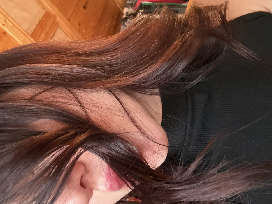 A close-up photograph depicts the right side of an individual's face and upper torso, reportedly located in Toksovo, Russia. Visible features include the right nostril, a segment of the nose bridge, philtrum, and an upper lip accented with pink lipstick. The face is partially obscured by voluminous, dark reddish-brown hair styled with a moderate wave. The individual is wearing a black, ribbed, high-neck sleeveless garment. The background is out of focus, revealing light-toned wooden paneling on a sloped ceiling or wall in the upper right quadrant, indicating an indoor setting with a pitched roof. Below the wooden structure, indistinct shapes and blurred colors suggest the presence of textile items, possibly clothing, in varying shades including red, green, and dark tones. Illumination appears to highlight the right side of the hair and the wooden background.
