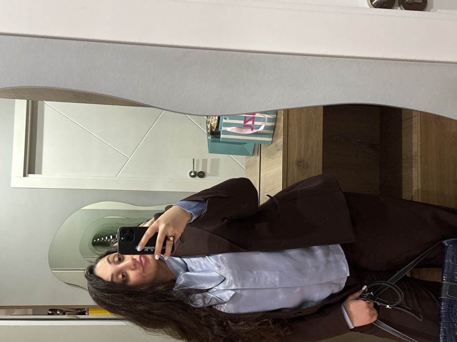 A female subject is depicted taking a mirror selfie in an indoor setting in Tbilisi, Georgia. She has long, dark, wavy hair and is wearing a dark brown blazer over a light blue, shiny blouse with a tied bow at the neck, paired with dark brown trousers. Her right hand holds a dark-colored smartphone, revealing a gold-toned ring with a dark stone on her ring finger and light-colored nail polish. Her left hand holds a dark blue, textured handbag, partially visible at the bottom of the frame. The background, reflected in the mirror, features a light-colored door with geometric groove patterns and a silver handle on the right. Below the door, a light brown wooden console table displays a teal-colored shopping bag and a white shopping bag with vertical pink stripes and the letters "JS". Other small, reflective objects are also on the console. To the left, a distorted, irregularly shaped mirror reflects a hallway, creating a repeated, tunnel-like visual effect.