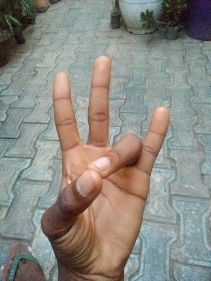 A right human hand, exhibiting dark skin tone, is centrally positioned, with the palm facing away from the viewer. The index, middle, and ring fingers are extended upwards, while the thumb and pinky finger are bent inwards towards the palm, forming a gesture resembling the number three. Fingernails are visible and unpolished. The foreground and mid-ground consist of grey interlocking concrete pavers arranged in a zigzag pattern. In the lower-left corner, the toe section of a left foot, shod in a green and brown flip-flop, is partially visible. The background, out of focus, displays several potted plants in assorted containers, including a white pot and darker-colored pots. The scene depicts an outdoor paved area, consistent with a patio or walkway. No discernible landmarks or specific features are present within the image to identify its precise location within the city of Bukuru, Nigeria.
