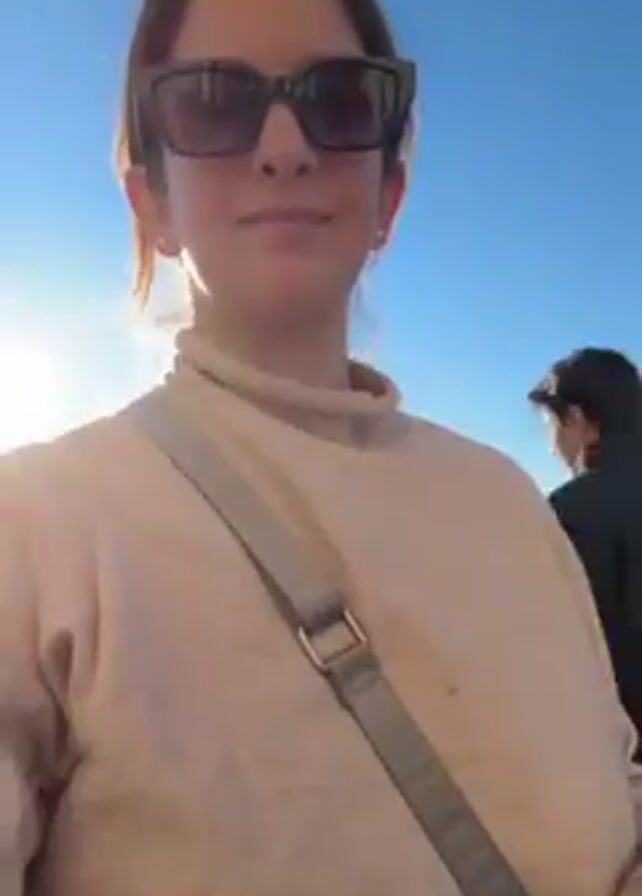 A woman in sunglasses stands in front of the Baptistery of Pisa. She wears a tan turtleneck sweater and a crossbody bag. The sky is clear and blue. Other people are walking around in the background. The woman seems to be taking a selfie or video.
