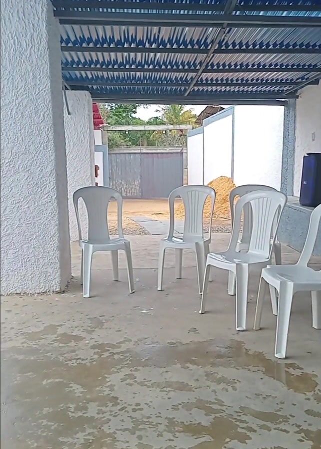 n outdoor recreational area featuring a small, tiled swimming pool with children playing in it. Several adults are standing nearby, seemingly chatting and observing the children. The area is partially covered by a blue corrugated metal roof and a tan shade sail, offering protection from the elements. White plastic chairs are scattered around, and a small wooden fence and some potted plants add to the ambiance. The ground appears wet, possibly from recent rain or splashing from the pool. A grey gate is visible in the background, indicating the property's boundary. The overall atmosphere suggests a relaxed and casual gathering.