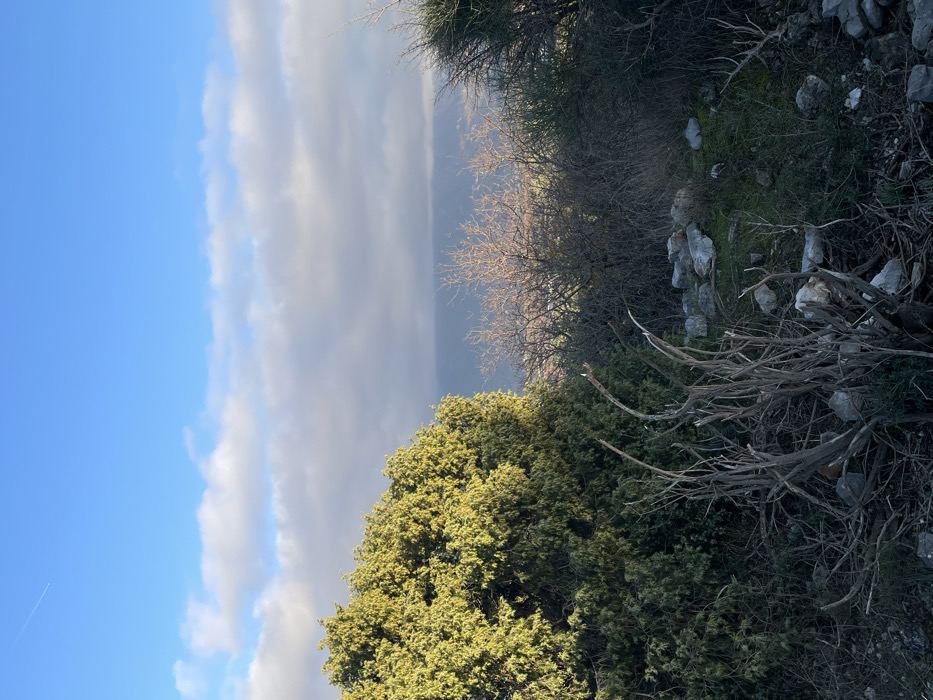 The image captures an outdoor natural landscape in Dubravcevina, Montenegro. The scene is dominated by varied vegetation and rocky terrain under a partially cloudy sky. The upper third of the frame shows a clear blue sky with a faint white airplane contrail visible in the upper left quadrant. Below this, a band of white and light grey stratocumulus clouds extends horizontally across the middle of the sky. In the midground-left, a large, densely foliated tree with bright green leaves stands prominently, illuminated by sunlight, casting some shadow below. To its right, a smaller, deciduous tree with numerous bare, thin, light-colored branches is also brightly lit. The foreground consists of rough, uneven ground covered with scattered light grey rocks, patches of green moss and sparse vegetation, and clusters of dark, gnarled, bare branches and dried twigs. Towards the right side of the midground, darker green, dense shrubs are present. In the background, beyond the immediate vegetation, distant hills or mountains appear as a hazy, muted blue-grey silhouette, partially obscured by the cloud band. No individuals, animals, or artificial structures are discernibly present.