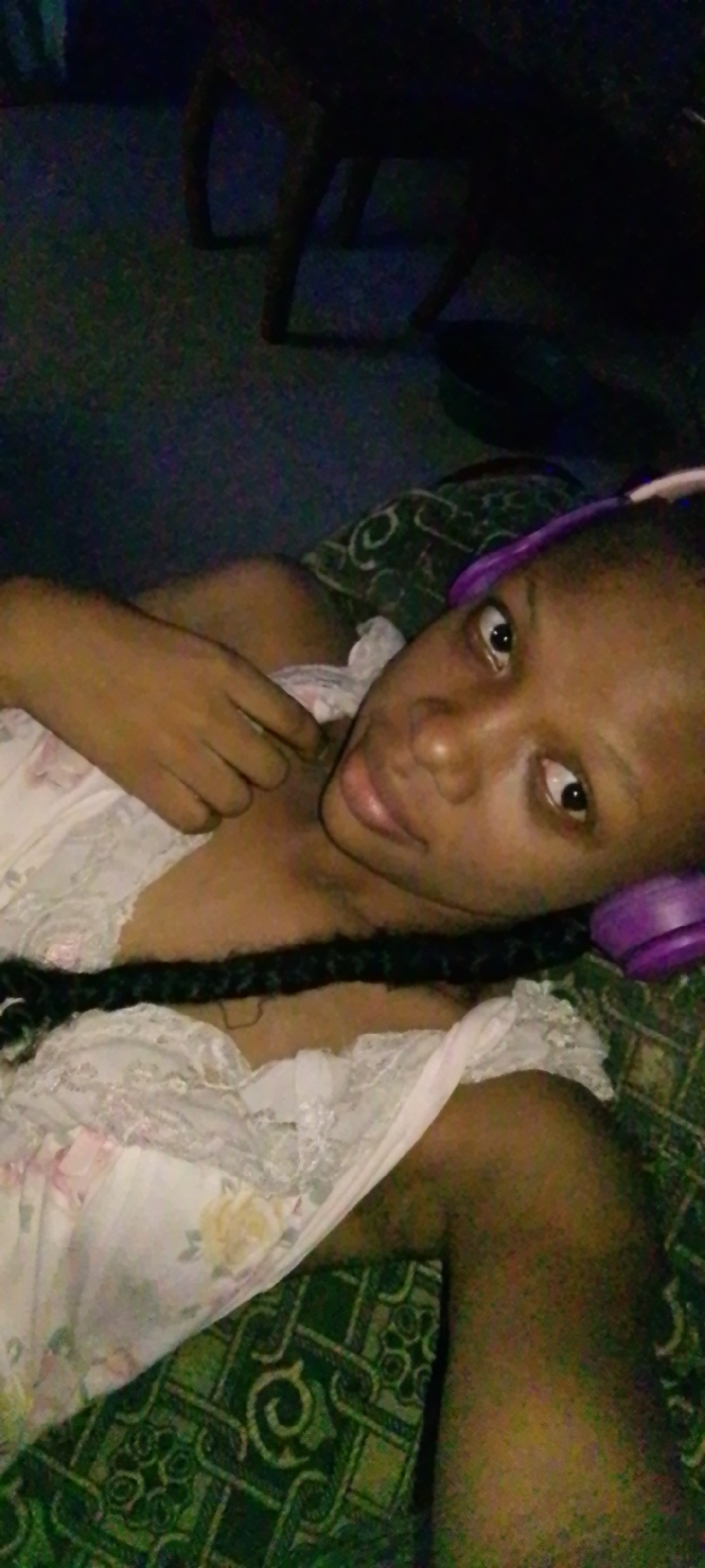 A dark-skinned female individual is depicted lying on her side in a dimly lit indoor setting. Her head rests on a green fabric with an intricate patterned design. She wears purple over-ear headphones and a light-colored garment with a floral pattern and lace trim, possibly a nightgown or dress. Her dark hair is styled in long braids extending across her chest. Her right hand is positioned near her upper chest. She looks directly towards the viewer with a neutral expression. The background is dark and indistinct, with faint outlines suggesting furniture legs on a darker surface. No specific city or location identifiers are visible within the image.