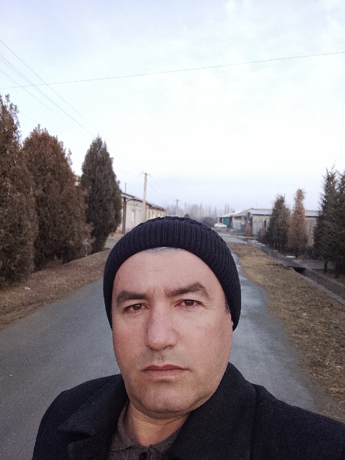A selfie depicts a man wearing a black beanie and a dark coat, standing on a rural road