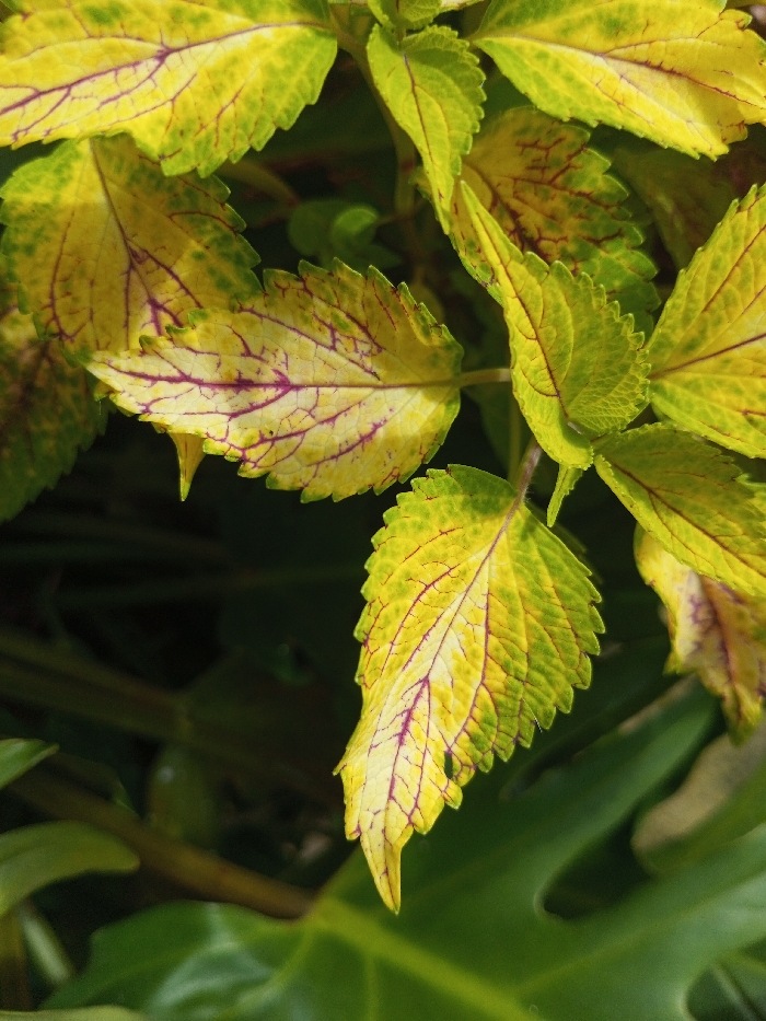 This image, captured in Mindat, Myanmar, presents a detailed close-up of a plant's variegated foliage. The scene features multiple leaves, each displaying a primary coloration of yellow-green and deep yellow, prominently highlighted by a network of reddish-purple veins. The edges of the leaves are distinctly serrated. The leaves are arranged in an overlapping configuration, with some partially obscuring others. The background is out of focus, appearing as a dark, indistinct blur composed of shadowy green forms, suggesting additional, unseen vegetation or obscured elements. No individuals, animals, or artificial objects are visible. There are no discernible actions or interactions depicted within the frame.