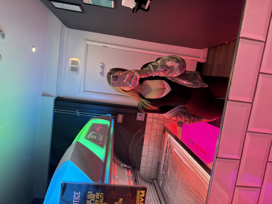 A young female is shown in a mirror selfie taken within a tanning salon booth located at the Underground Gym in Tunbridge Wells, United Kingdom