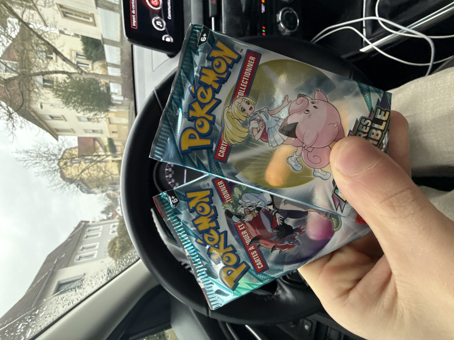 - "A first-person view from inside a stationary vehicle shows a right hand holding two sealed Pokémon trading card booster packs in the foreground" by FM-P9stI3, licensed under CC BY 4.0