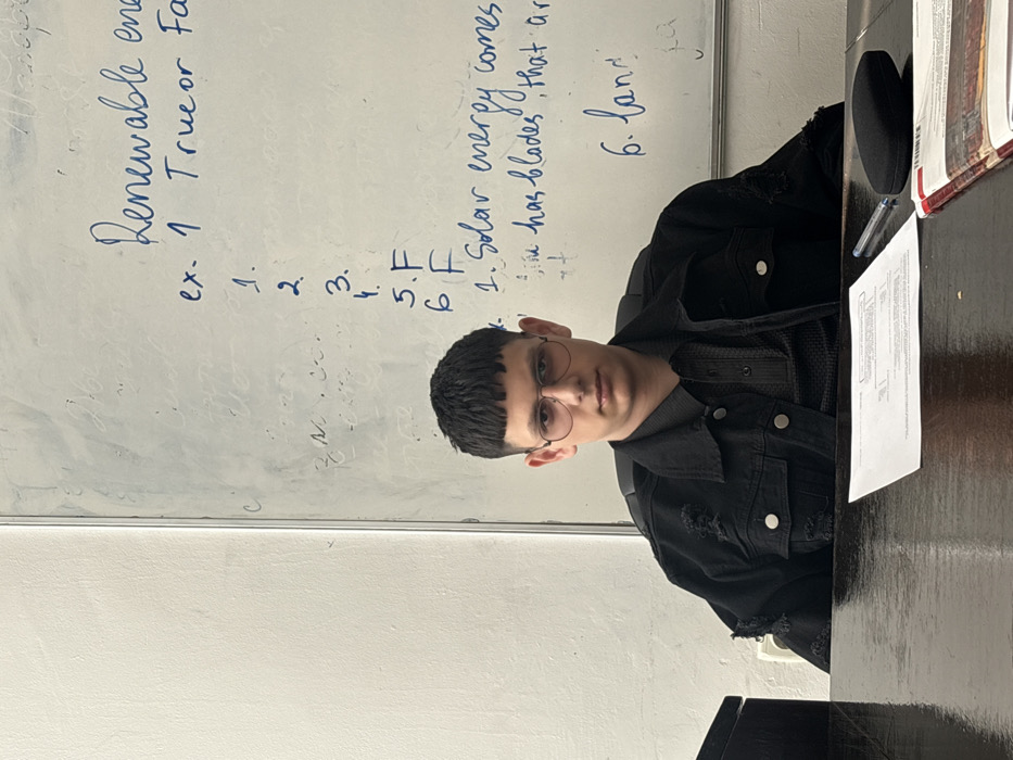 A young male individual is seated upright at a dark wooden desk in what appears to be a classroom located in Kozloduy, Bulgaria. He possesses short, dark hair with a prominent fringe and wears round, wire-rimmed glasses. His attire consists of a dark, possibly patterned, collared shirt beneath a distressed black denim jacket. He maintains a neutral facial expression, looking directly forward. On the desk in the foreground, from left to right, are a white document with printed text, a blue pen, a black hard case, and an open book displaying text and images. In the background, a white board is visible, bearing handwritten blue text related to "Renewable ene," "ex. 1 True or Fa," a numbered list, specific answers "5.F" and "6.F," and partial sentences such as "1. Solar energy comes" and "has blades, that are." A plain white wall is visible to the left of the whiteboard.
