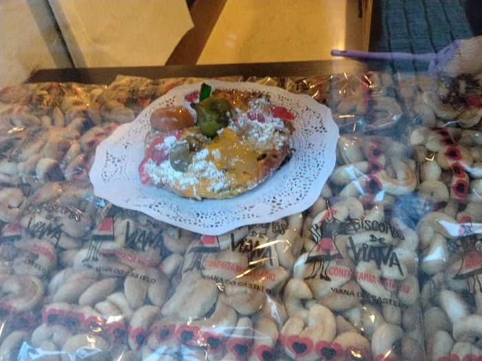 A bakery display case features a ring-shaped cake dusted with powdered sugar and decorated with candied fruits, resting on a white lace doily. Surrounding it are numerous packages of biscuits. The packages are transparent, revealing crescent-shaped cookies, some with heart-shaped decorations. The text on the cookie packages reads "Biscoitos de Viana" and "Confeitaria Viana do Castelo." The image suggests a selection of traditional Portuguese pastries available for purchase.