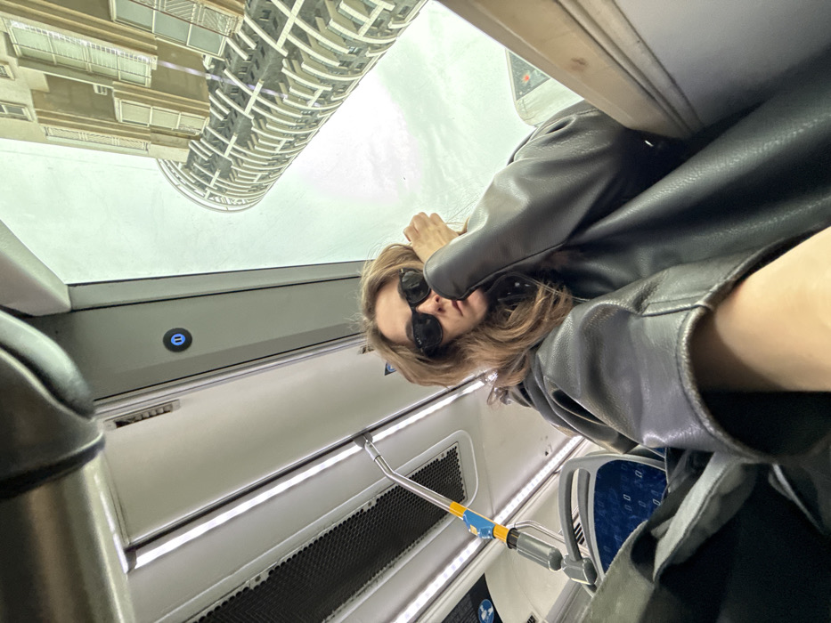 A woman with sunglasses and a leather jacket sits inside a train. The train interior has overhead windows, revealing a tall, curved building exterior. The camera angle is from below, looking up at the woman. The train interior features white walls, LED lighting, and blue patterned seats. A metal pole is visible in the foreground.