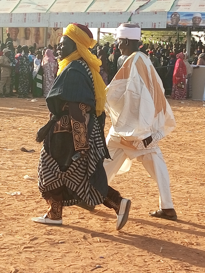 Two men in traditional attire walk across a sandy area. The man on the left wears a yellow turban, a dark tunic with patterned sleeves, and striped fabric at the waist. His shoes appear to be white slip-ons. The man on the right wears a white cap and a white robe with tan vertical stripes on the shoulders. He wears dark shoes. In the background is a crowd of people and a banner with images of men.