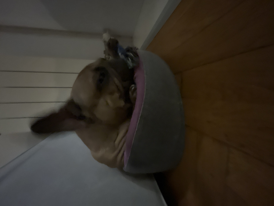A small brown dachshund curls in a grey dog bed with a pink rim. The dog's head is tucked, and its paws are visible near a toy. The bed sits next to a white cabinet or surface on one side and a wood-paneled wall on the other. The image is dim, making details somewhat obscured.