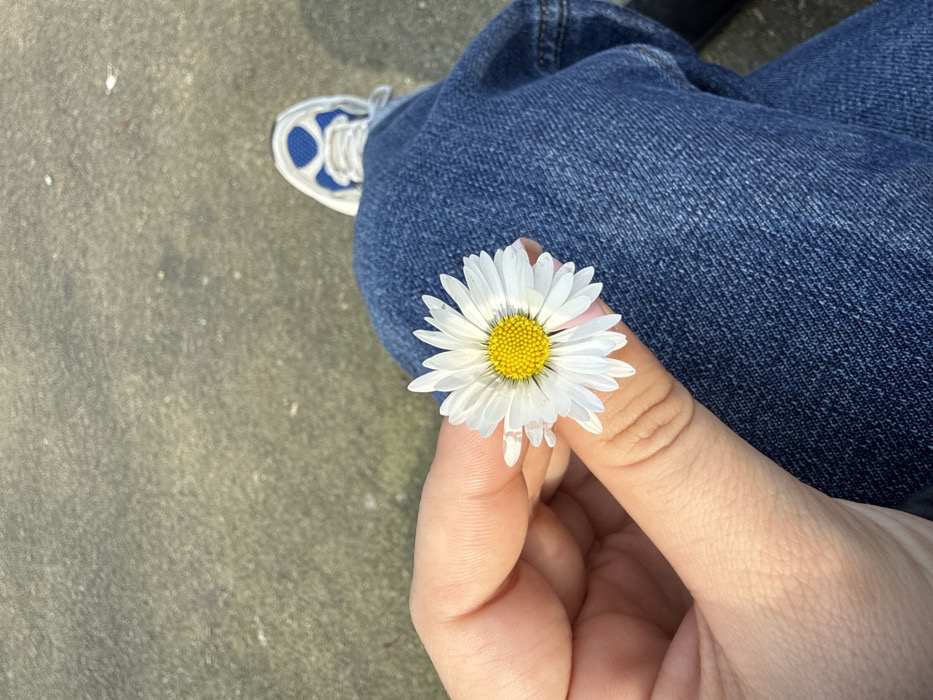 - "A first-person perspective photograph taken in the city of Burgas, Bulgaria, depicts a person's left hand holding a single white daisy" by FM-Xdph43, licensed under CC BY 4.0