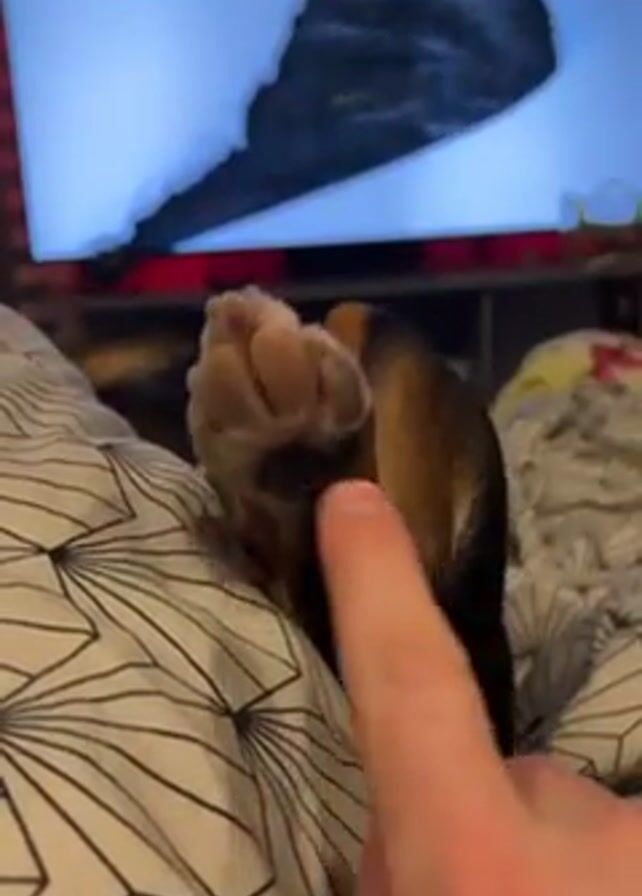 A person is touching the paw of a sleeping beagle dog that is lying on a bed