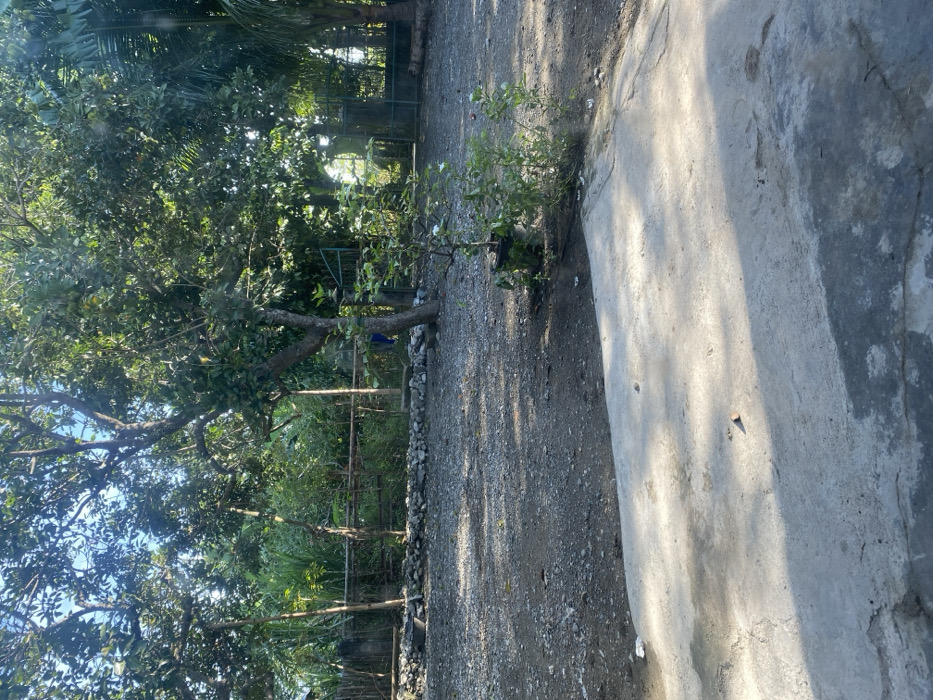 Lush greenery fills the left side of the image, featuring trees and possible vegetation. A fence made of bamboo or thin wooden poles is also visible. The central area shows a gravel or dirt ground with some rocks. To the right, there's a paved surface, likely concrete, that takes up a significant portion of the frame. The sunlight casts strong shadows on the ground and the concrete surface.