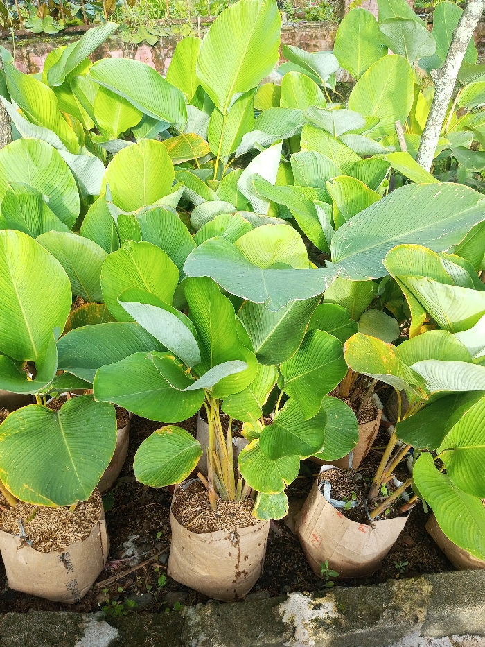 A lush grouping of Calathea lutea plants fills the scene, each potted in a tan, paper-like material