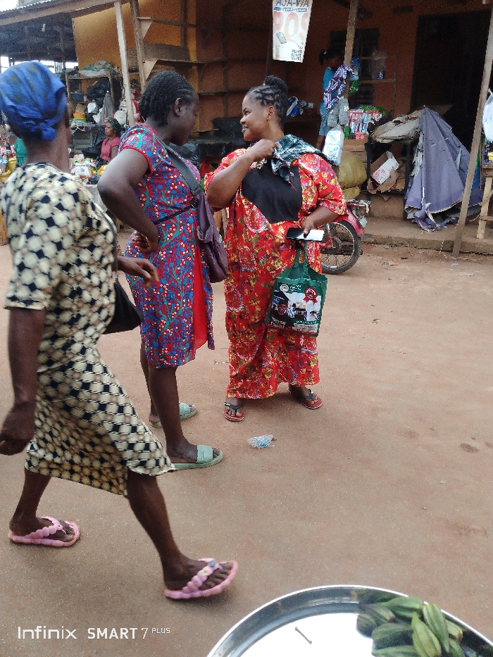Three women are in an outdoor setting, possibly a market. The woman on the left is walking away, wearing a patterned dress and pink sandals. The woman in the center is standing with her hands on her hips, wearing a blue and red floral dress and green sandals. To her right, the third woman is holding a bag and a phone, wearing a red floral dress with a black panel and red sandals. Some goods are visible in the background.