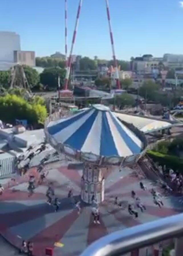 Here's a description of the scene in the video: The video shows a high-angle view of an amusement park ride. The main focus is a spinning swing ride with a blue and white striped canopy and a red and gray striped base. Riders are seated on swings that are extended outward as the ride spins. There are people watching the ride from below. In the background, there are other amusement park attractions, including a tall, red and white striped tower-like structure. Buildings, trees, and people can also be seen in the distance. The sky is clear and blue. The video appears to be taken from another high vantage point within the park.