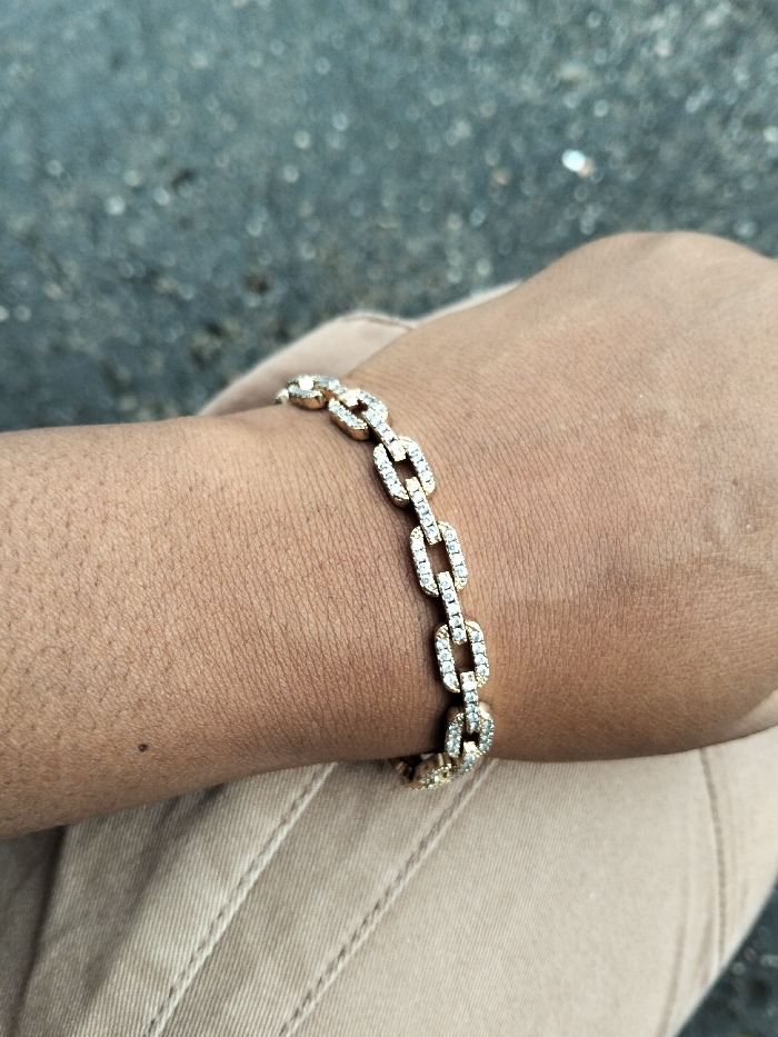 This image depicts a close-up view of an individual's right wrist and forearm, resting on a beige or light brown fabric garment, in Port-Harcourt, Nigeria. The skin tone of the arm is dark. A gold-toned link bracelet, encrusted with multiple small, clear, faceted stones on each link, is worn on the wrist. The garment features visible stitching. The background is a heavily blurred, dark grey, granular surface, consistent with outdoor pavement such as asphalt or concrete, indicating an outdoor setting. No other individuals or specific actions are visible.