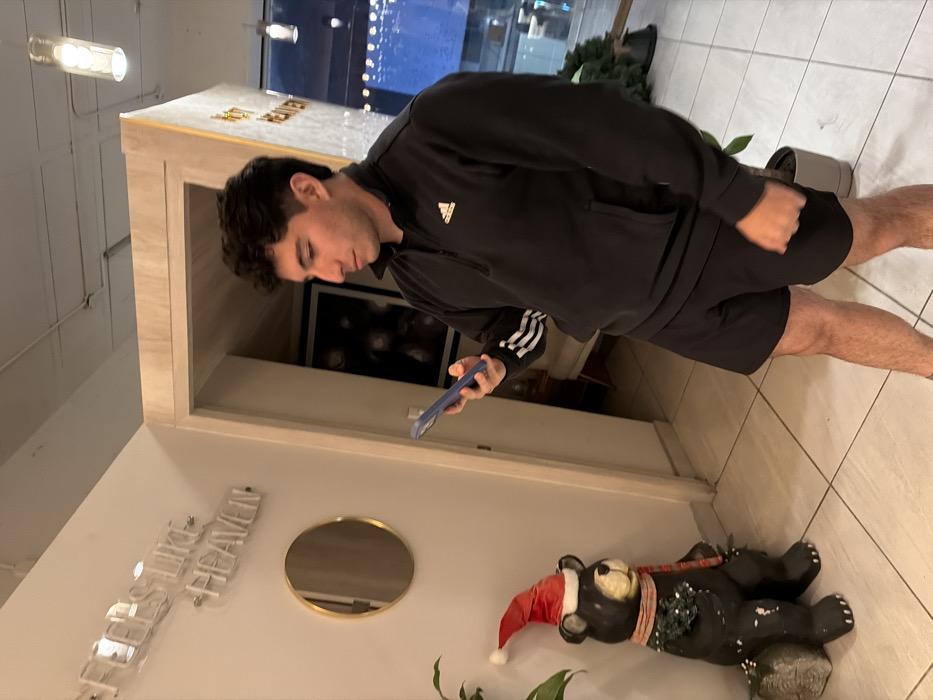 A man in a black Adidas tracksuit holds a smartphone, looking down at it. He is standing indoors near a wall with a round mirror, a neon sign reading "Feels Like Heaven", and a decorative black bear wearing a Santa hat. The room features tiled flooring and a view of a cityscape outside the window.
