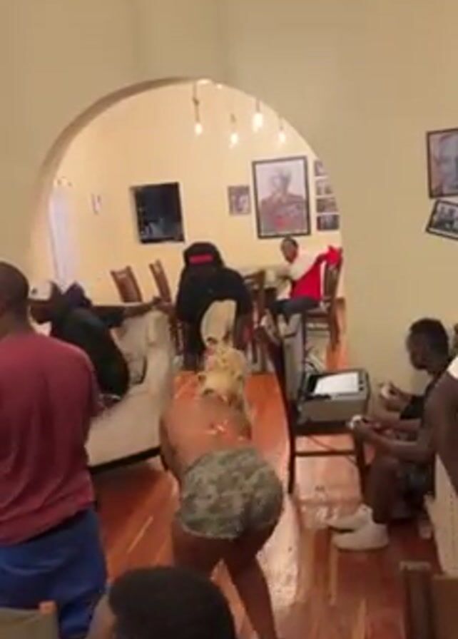In a room with light yellow walls and a wood floor, at least nine people are gathered. A woman with blonde hair, wearing an orange bikini top and camouflage shorts, is dancing in the center of the group. Surrounding her are other people, some dancing and some watching. The room is furnished with chairs and a cream-colored sofa. In the background, through an arched doorway, is another room with a dining table and chairs. Pictures adorn the walls in both rooms. The overall atmosphere seems festive. The lighting is bright, indicating the room is well-lit.