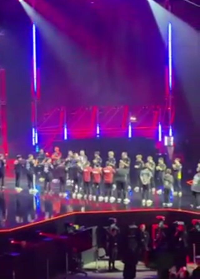 large group of people standing on a stage in a venue. They are being filmed by the audience who are holding up their phones. The stage is lit with blue and red lights. There are two large screens in the background. The audience are clapping.