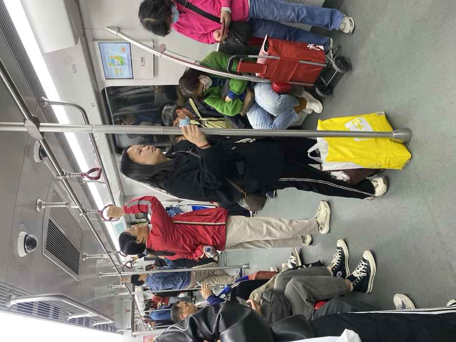 crowded subway car with passengers. Several individuals are standing and holding onto handrails. One woman in a red jacket is gripping a handle, while another in black is looking at her phone. Other passengers are seated or partially seated, some with bags and luggage nearby. Many people appear to be wearing masks. The interior of the subway is gray and white, with advertisements displayed on a screen.