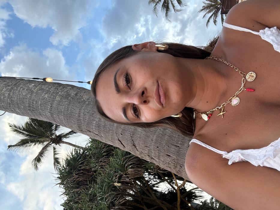 A female individual is depicted in a close-up, chest-up shot, facing the camera directly with a neutral expression. She has medium-brown hair and wears a white camisole-style top, gold-colored hoop earrings, and a gold-colored chain necklace adorned with multiple charms including a red chili, a pink heart, a starfish, and circular medallions. A reddish mark is visible on her right shoulder. Behind her, a thick palm tree trunk extends diagonally across the frame from lower left to upper right. To the left of the trunk, dense green tropical foliage is visible. A second palm tree is partially visible in the upper right background. A string of warm-toned incandescent bulb lights hangs vertically, partially obscured by the main palm tree. The sky above is blue with scattered white clouds, indicating an outdoor, possibly late afternoon or early evening, setting. The tropical vegetation and decorative lighting suggest a coastal or resort area in Mirissa, Sri Lanka.
