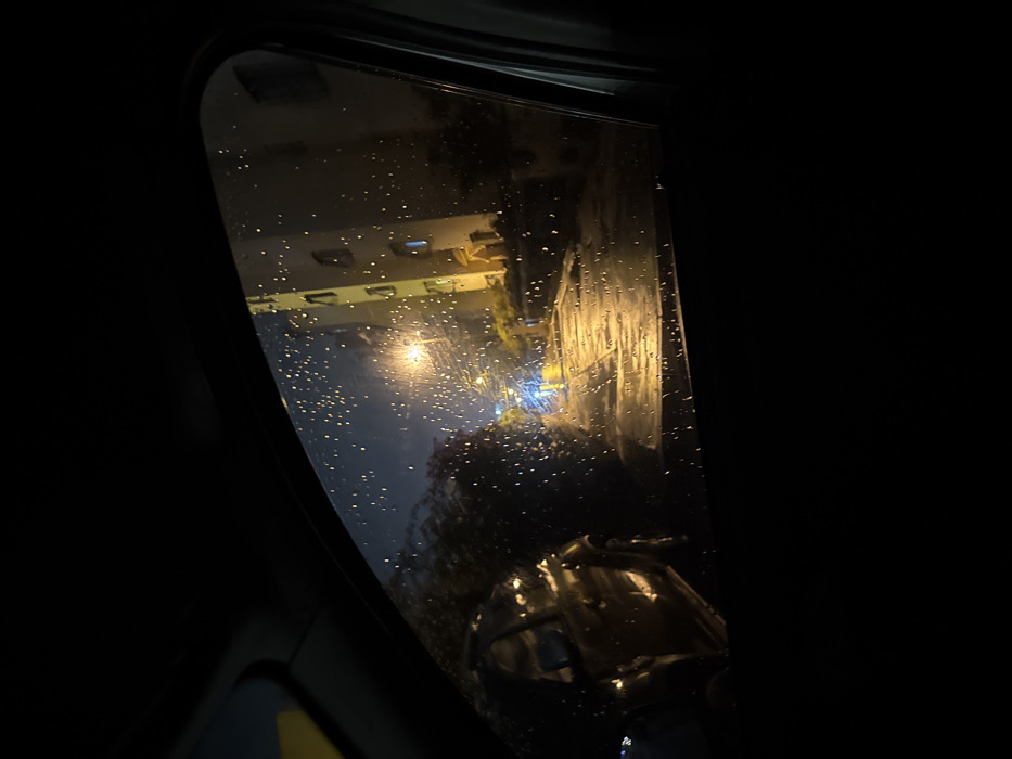 Raindrops cling to a car window, obscuring the view of a building across the street. Lights from a street lamp cast a blurry glow, reflecting off the wet surface. A dark, indistinct shape in the foreground suggests part of the car's interior. The rest of the scene is enveloped in darkness, emphasizing the wet and obscured view through the glass.