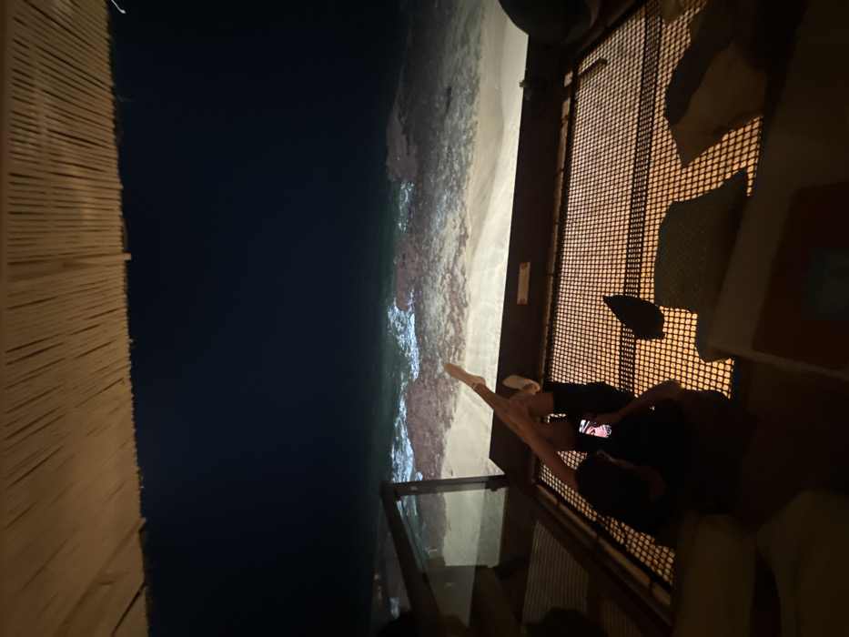 A woman in black clothes sits on a netting platform overlooking the ocean at night. Her legs are stretched out toward the glass barrier, and she is looking at a phone. Cushions and a table are nearby. A thatched roof covers the left side of the image, while the ocean stretches into the darkness to the left.