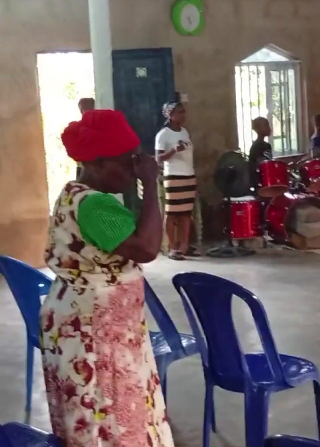A church service seems to be in progress in this video, indoors. A woman in a red head covering and a floral dress stands in the foreground, holding something to her mouth, possibly singing or praying. Several blue plastic chairs are in front of her. Behind her, another woman in a striped skirt is standing, perhaps leading the service. To the right is a drum set and other musicians. A green clock hangs on the wall in the background. The environment appears simple, with a concrete floor and plain walls. Light comes in from windows.