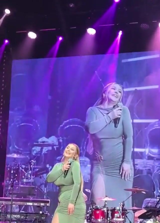A female singer in a green dress performs on stage, illuminated by purple lights. She holds a microphone and gestures to the crowd, while a large screen behind her shows a replay of her performance, but in a gray dress. A band is visible behind her and a few people are in the audience, watching the show. The stage has a drum set and a keyboard.