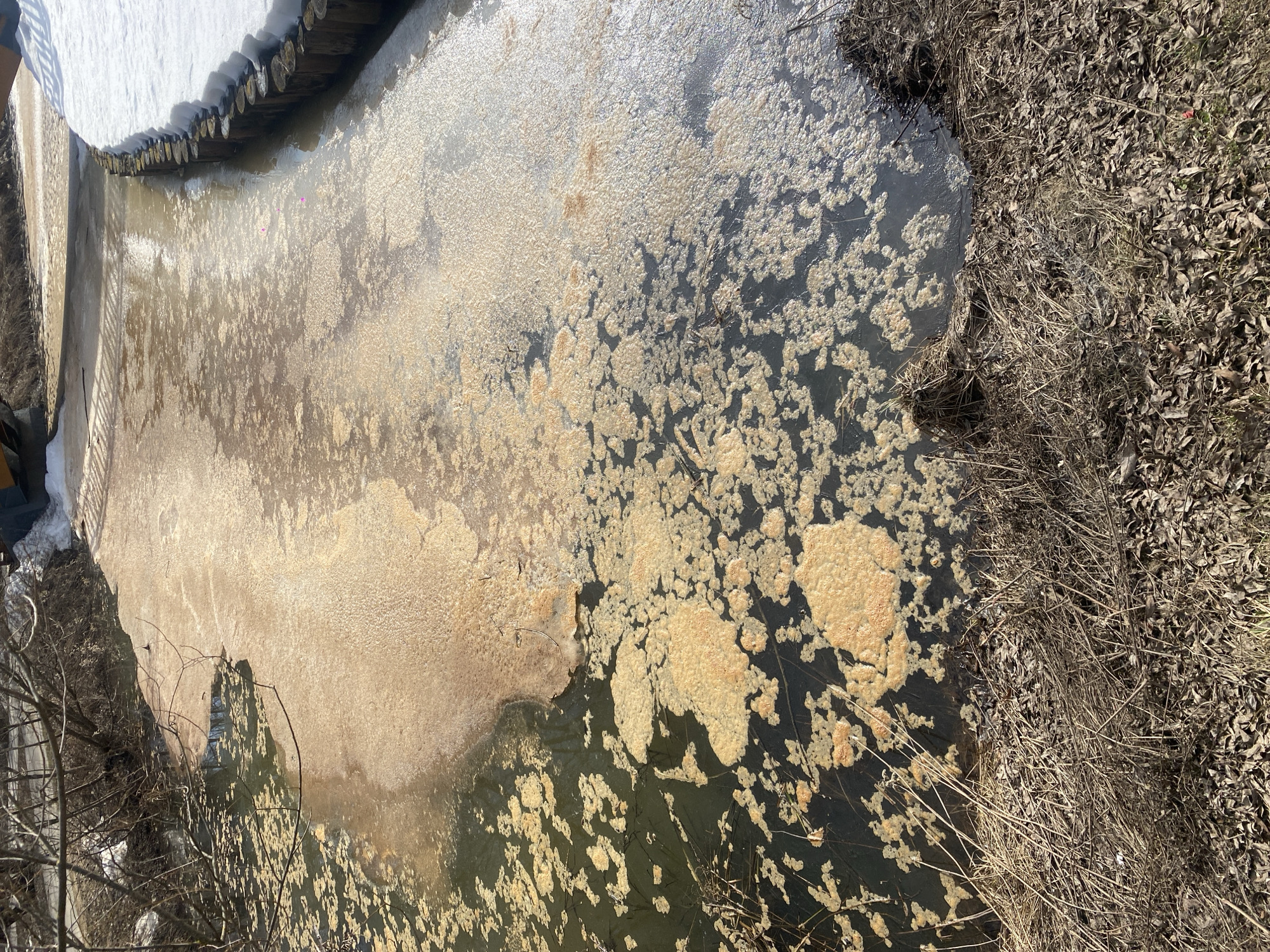 In a Moscow, Russia, urban or suburban setting, a narrow outdoor water channel, likely a stream or ditch, is visible under clear daylight. The water's surface is largely covered by a thick, uneven layer of yellowish-brown, cellular foam or scum, with irregular patches of darker, seemingly murky water showing through. The left bank is characterized by dry, matted brown grass and fallen leaves, with bare, dormant tree branches extending over the water. The right bank features a retaining wall constructed from vertically embedded short wooden logs. Adjacent to this wall, a significant accumulation of melting snow forms a distinct bank. In the background, partially obscured, bare trees, a possible road or pathway, and a segment of yellow construction equipment (likely an excavator) are discernible. No individuals or specific actions are observed. The environment suggests a transition period from late winter to early spring.